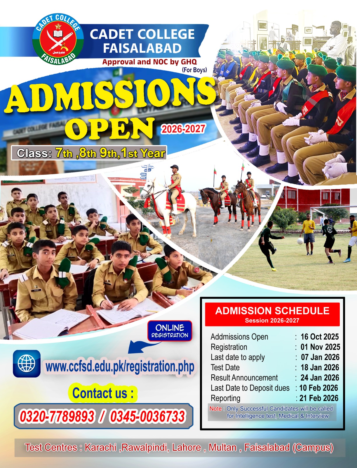 Cadet College Faisalabad endeavors to become the hallmark of admirable excellence in the array of cadet colleges through highly qualified & well-trained faculty & staff, students centered & technology driven teaching, conducive & pollutionfree environment, healthy food and rigorous training.